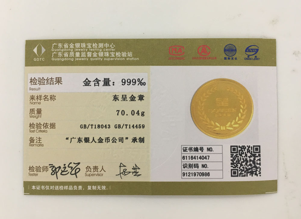 • 國家權威機構純金銀紀念幣章金銀含量檢驗報告