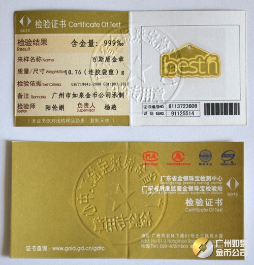 2013年11月廣東百斯盾公司純金千足金黃金紀念金牌定制