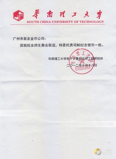 2012年10月;華南理工大學校友會生產制作銀條999銀條定制