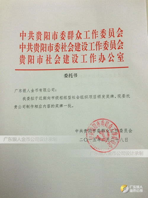 廣東銀人金幣公司設計制作承接中共貴陽市委、民政局、財政局、群工委、中共貴陽市委社會建設工作委員會、貴陽市社會建設工作辦公室表彰樞紐型社會組織項目榮譽獎狀、先進集體獎牌、先進單位獎牌、先進個人牌匾、高檔鈦金獎牌定制。