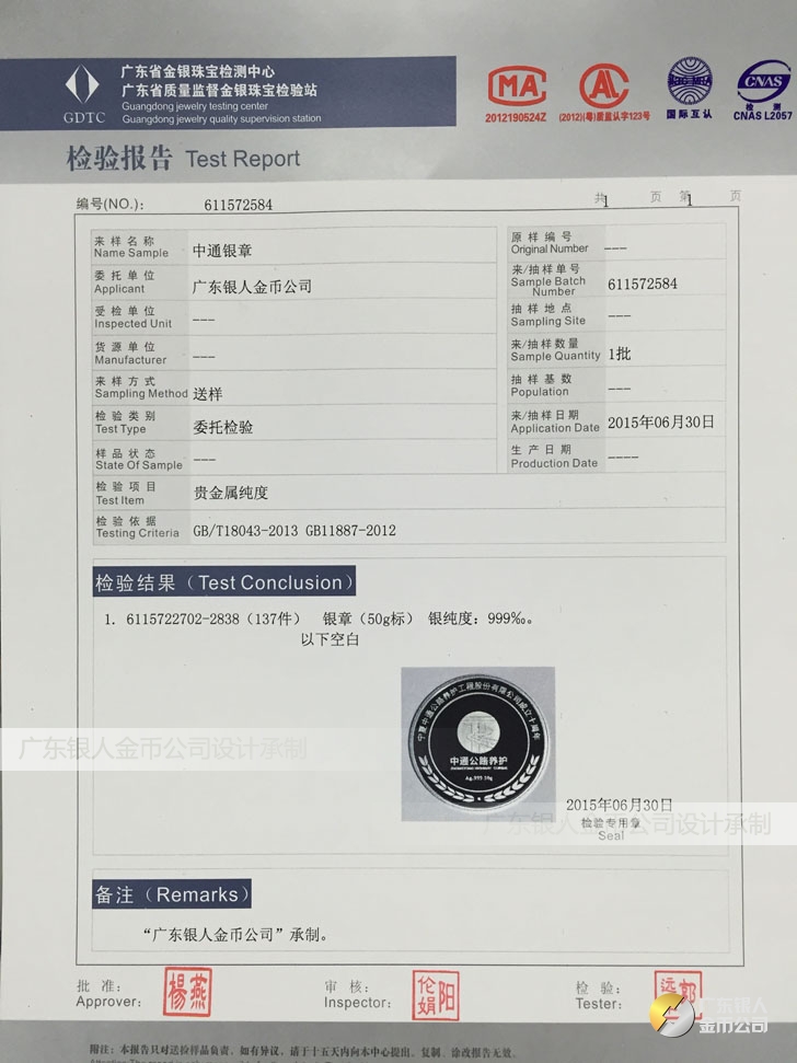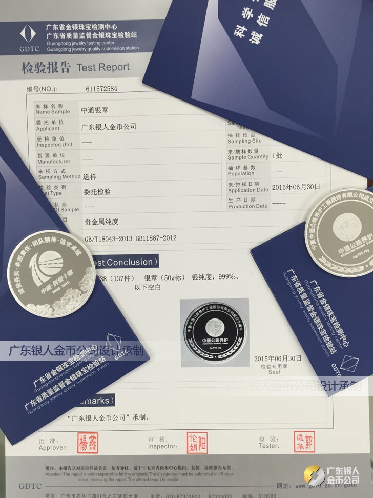 廣東銀人金幣公司承接客戶個性化定制的金銀幣、金銀章、金銀條、金銀牌、金銀盤均由國家質監部門、嚴格檢測、權威鑒定: