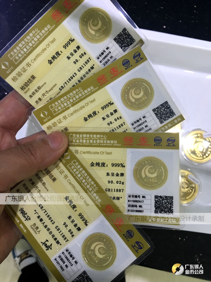 廣東銀人金幣公司承接客戶個性化定制的金銀幣、金銀章、金銀條、金銀牌、金銀盤均由國家質監部門、嚴格檢測、權威鑒定:
