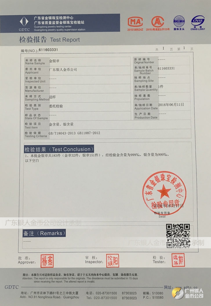 廣東銀人金幣公司承接客戶個(gè)性化定制的金銀幣、金銀章、金銀條、金銀牌、金銀盤均由國家質(zhì)監(jiān)部門、嚴(yán)格檢測、權(quán)威鑒定: