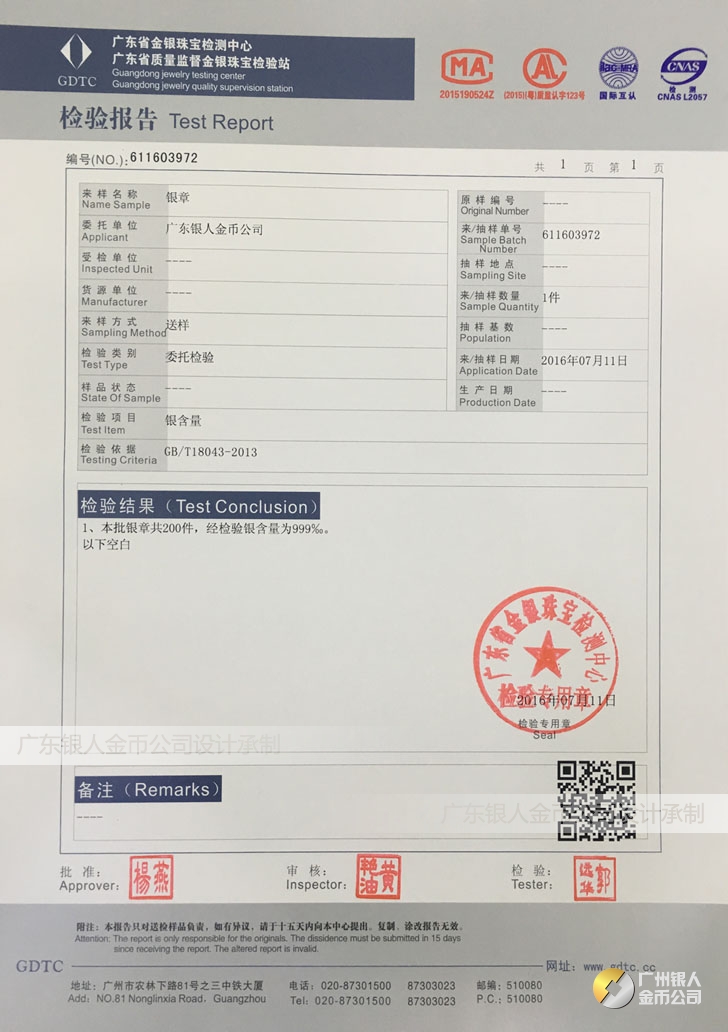 廣東銀人金幣公司承接客戶個(gè)性化定制的金銀幣、金銀章、金銀條、金銀牌、金銀盤均由國(guó)家質(zhì)監(jiān)部門、嚴(yán)格檢測(cè)、權(quán)威鑒定: