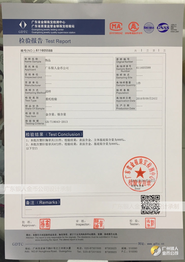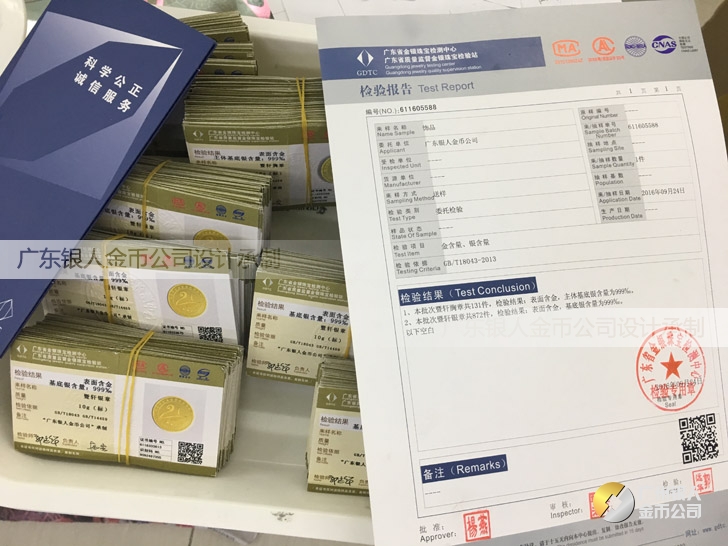 廣東銀人金幣公司承接客戶個(gè)性化定制的金銀幣、金銀章、金銀條、金銀牌、金銀盤均由國家質(zhì)監(jiān)部門、嚴(yán)格檢測(cè)、權(quán)威鑒定: