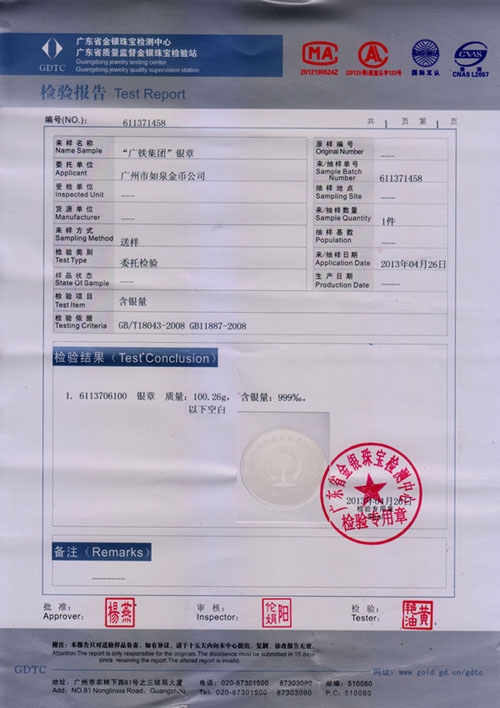 • 2014-6月:廣東萬銀貴金屬經營公司定制純銀紀念章與紀念銀條加工制作。