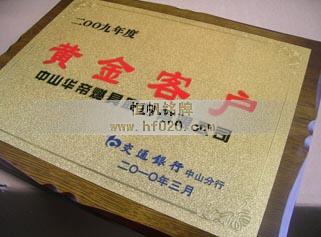 交通銀行——為交通銀行中山分行批量“交通銀行中山分行2009年度”黃金客戶獎(jiǎng)牌、五星級(jí)黃金客戶獎(jiǎng)牌牌匾及銀行獎(jiǎng)牌、銀行獎(jiǎng)狀。
