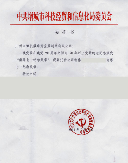 • 2011-7月:定制廣東省增城市科技經貿和信息化局50年黨齡以上老黨員南粵七一紀念獎章。