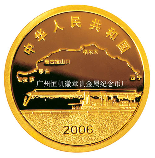 1/4盎司金質紀念幣正面圖案為青藏鐵路線路示意圖及鋪軌機工作圖,并刊國名、年號。