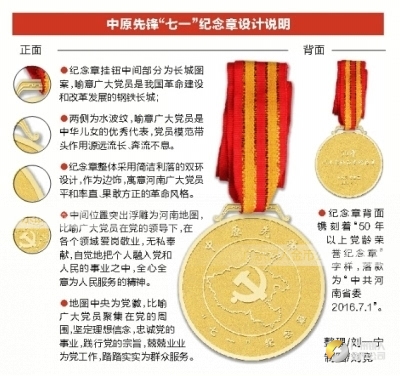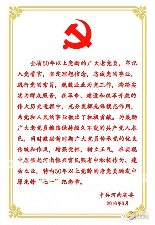 為50年以上黨齡老黨員頒發“七一”紀念章,在我省尚屬首次。省委組織部負責同志介紹說,中原先鋒“七一”紀念章的設計方案,是經省委主要領導親自審定的。這個紀念章,蘊含著省委對50年以上黨齡老黨員幾十年來忠誠黨的事業、踐行黨的宗旨、兢兢業業為黨工作、踏踏實實為群眾服務的敬重和肯定,同時也傳遞著省委對老黨員的關心、愛護與牽掛。省委希望通過向老黨員頒發“七一”紀念章,鼓勵廣大老黨員繼續保持經久不變的共產黨人本色,同時激勵新時期廣大黨員傳承黨的優良傳統和作風,增強黨性,樹立正氣,在實現中原崛起河南振興富民強省進程中積極作為、建功立業。