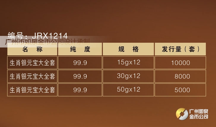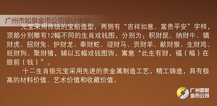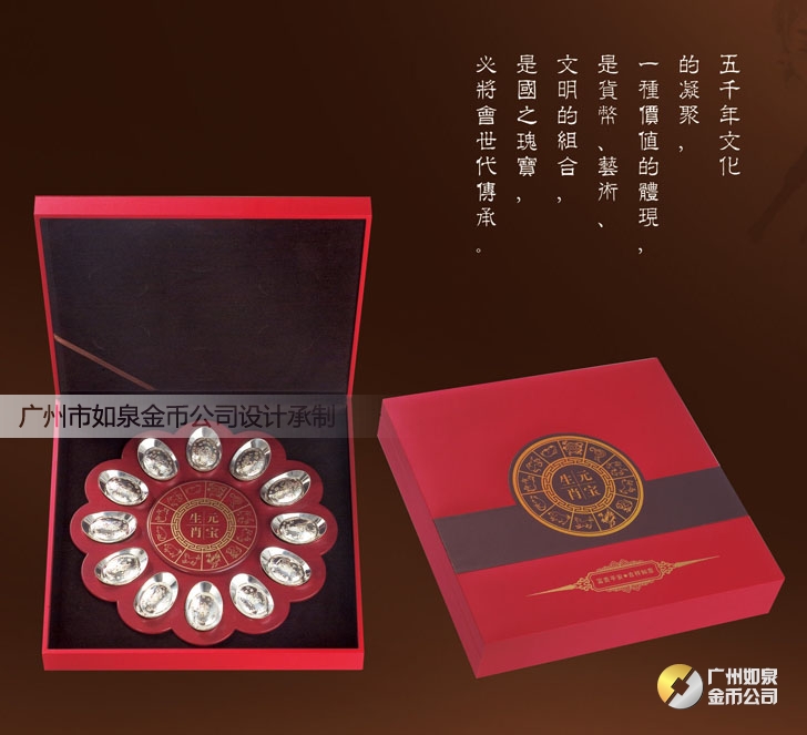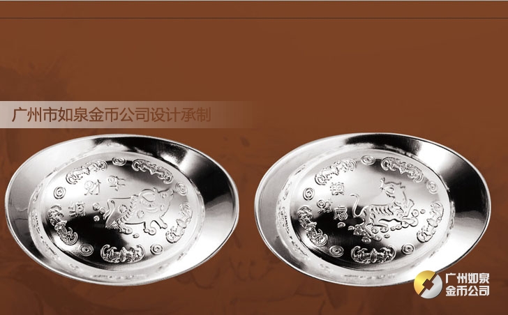 廣州市如泉金幣公司依托上海造幣廠和深圳國寶造幣廠等造幣公司以及金銀制品廠,設計定做紀念幣、紀念章、金銀幣、金銀章、金銀條,采用造幣工藝、選用千足金銀,個性定制金幣、定做銀幣、訂做金條、訂制銀條、制作紀念銀幣、制造紀念金幣、加工紀念銀章、生產紀念金章,純金純銀鑄造、全部國檢、權威檢測。
