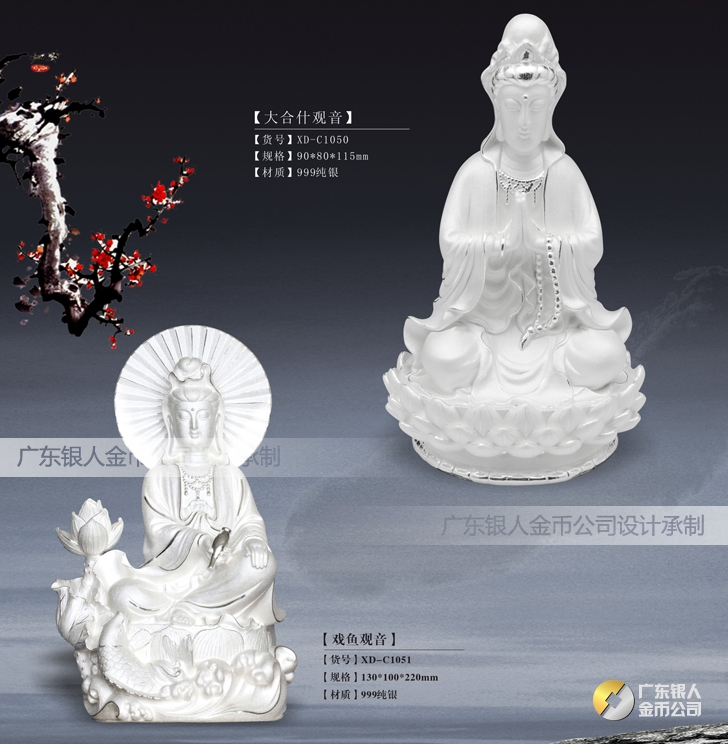 放生觀音純銀擺件、純銀戲魚放生觀音菩薩工藝擺件